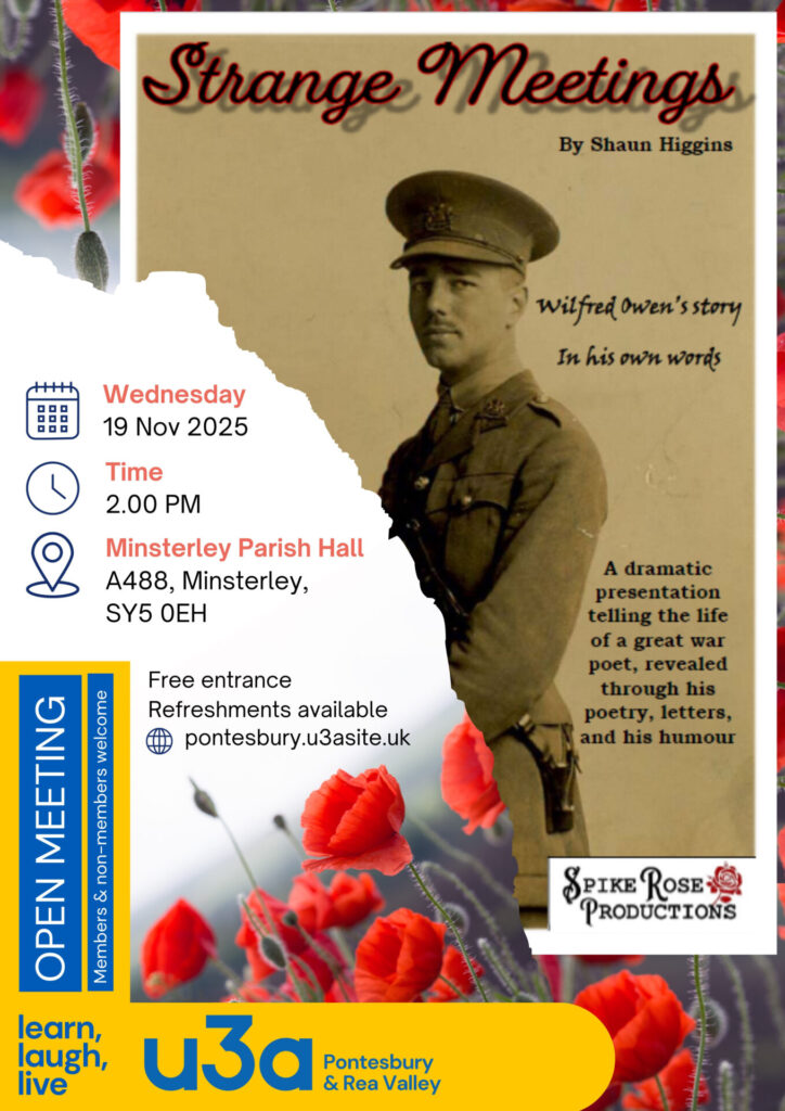 As we enter a time of remembrance, Pontesbury & Rea Valley u3a warmly invites you to our Open Meeting on 20th November for a special performance of Strange Meetings, presented by Shaun Higgins.